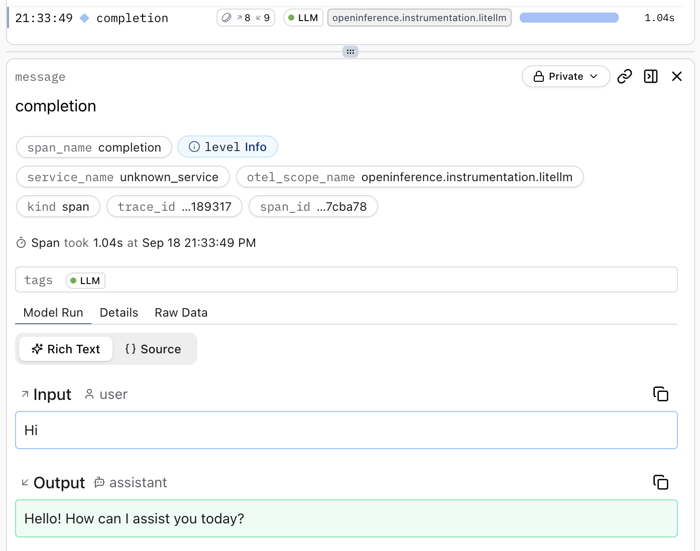 This creates a span which shows the conversation in the Logfire UI: